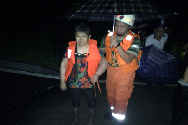 20时40分,救援官兵又接到人民山群众报警。由于曹山村救援未结束,指挥员立即下令:一组官兵继续在此救援,另一小组迅速赶往人民山营救被困群众。由于水位上涨,出入的村路洪水齐腰,村民无法出入。大队官兵迅速派出三名水性较好的官兵带上安全绳、腰带、救生衣对被困居民进行营救和疏散,优先将老人妇女和儿童转移至安全地带。经过一个多小时的排险,中队官兵共疏散群众20余人,救出群众7人。